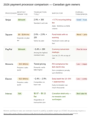 Canadian gym owners spend roughly 3-5% of their gross revenue on the invisible infrastructure of moving money. This guide audits the two-pillar cost structure—software logic and transactional tolls—while detailing "unseen" line items like Stripe’s 0.7% billing fee, Moneris’s new 2026 manual entry surcharges, and the reality of liquidated damages in legacy contracts.